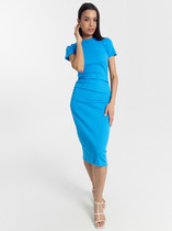Женское платье в горошек полуприлегающего силуэта выполнено из двух видов тканей: верхнее - из шифона, нижнее - из сатина. Платья скреплены между собой. По переду изделия - декоративные настрочные рюши; по линии талии вставлена резинка; втачные рукава с манжетой по низу застегиваюся на петлю и пуговицу; удлененная линия низа по бокам. По спинке вырез в виде "капельки", который застегивается на петлю и пуговицу. В комплекте съемный пояс из основной ткани. Платье полностью соотвествует заявленному размеру. Пожалуйста, пользуйтесь таблицей обмеров готового изделия.