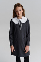 Платье коктейльное для девочки А-образного силуэта, средней длины, с втачными короткими рукавами, круглым вырезом горловины. Застёжка сзади на навесную петлю с пуговицей. Ткань- кружевное полотно на подкладке из кулирного полотна.