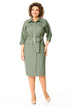 Платье женское А-силуэта выполнено из плательной ткани. Горловина округлой формы обработана обтачкой с кантом из отделочной ткани. Платье разрезное по линии талии, нижняя часть по переду и спинке с небольшой сборкой. Рукава втачные с отложными манжетами из отделочной ткани. В боковых швах обработаны карманы. Пояс платья выполнен путем комбинирования основной и отделочной ткани. Изделие декорировано дизайнерской печатью.