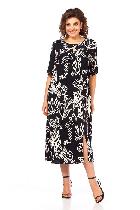 Платье женское, нарядное, А-силуэта, изготовлено из плательной ткани. Горловина круглой формы обработана окантовкой,на спинке застежка на петлю и пуговицу.. Рукав втачной. Перед с асимметричным подрезом, в котором обработан вырез горловины и разрез. По линии талии имеется кулиса с декоративными завязками. В левой верхней части переда кокетка от которой заложены складки. Спинка цельнокроенная.