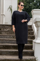 Платье женское прямого силуэта, изготовлено из трикотажного полотна и атласа. Платье отрезное ниже линии талии, со вставкой имитирующей пояс из отделочной ткани, с кулисой и втянутым шнуром. Горловина круглой формы с отделочным кантом. В нижней части платья обработан элемент с эффектом запаха. Обработаны карманы. Рукава втачные, длинные. Спинка разрезная с фигурным низом.