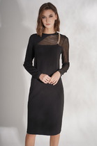 Платье женское, прямого силуэта, выполнено из трикотажного полотна. Горловина и низ рукавов обработаны декоративным довязом. Застежка на тесьму-молнию. По переду нагрудные вытачки и клапаны. По боковому шву шлица, декорирована пуговицами. Спинка со средним швом. Рукава втачные, длинные. В комплекте ремень.