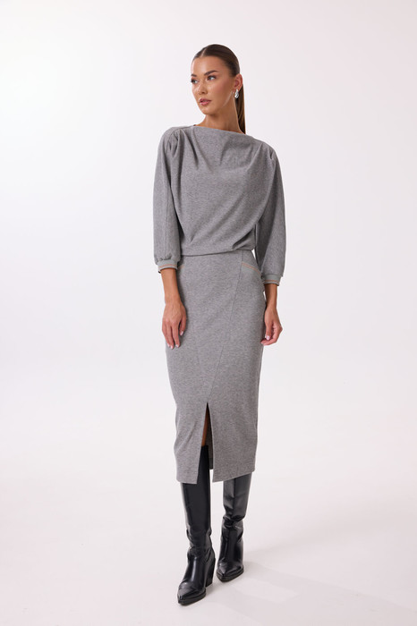 Платье женское полуприлегающего силуэта, отрезное по линии талии. Лиф платья кроя «летучая мышь». Перед лифа цельнокроеный. Спинка лифа цельнокроеная. Горловина лодочкообразной формы. В области плечевых швов застрочены защипы для формирования складок по переду. Низ рукавов обработан притачной манжетой из ткани-компаньона. Перед юбки с декоративными подрезами и имитацией прорезных карманов с листочкой из ткани-компаньона, обработан разрез. Заднее полотнище юбки цельнокроеное.