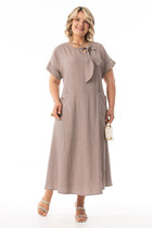 Платье женское прямого силуэта без подкладки из трикотажной ткани длиной до середины икры. Передняя часть платья со средним швом. По левой половинке переда внизу платья пришит волан из ткани – компаньона. По правой половинке переда настрочен нагрудный карман из ткани – компаньона с декоративными элементами. В боковых швах платья функциональные карманы. Спинка платья со средним швом, в котором расположена застежка – «молния». По низу левой половинки спинки пришит волан из ткани – компаньона. Горловина имеет округлую форму. Линия плеча спущена. Рукав выполнен из ткани – компаньона со сборкой вверху рукава и резинкой по низу рукава.
