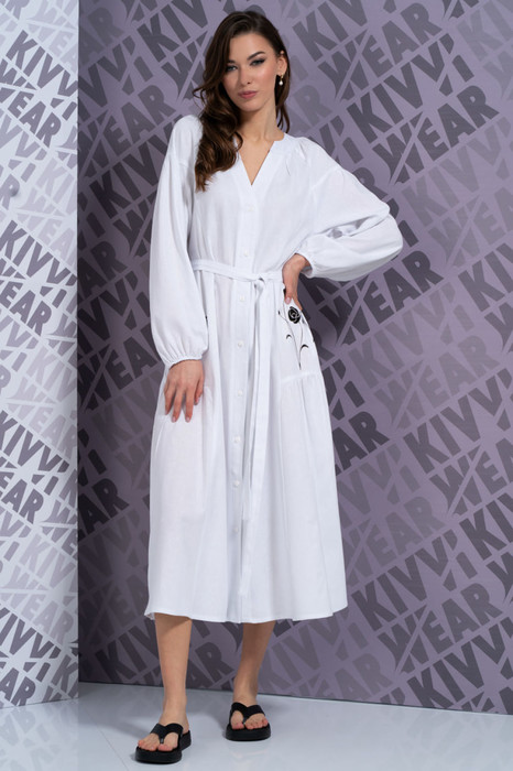 Платье застегивается на ряд пуговиц, расположенных по всей длине передней части, что обеспечивает идеальную посадку на любой фигуре. Дополняет образ стильный пояс из той же ткани, который подчеркивает талию и придает силуэту женственность и элегантность.