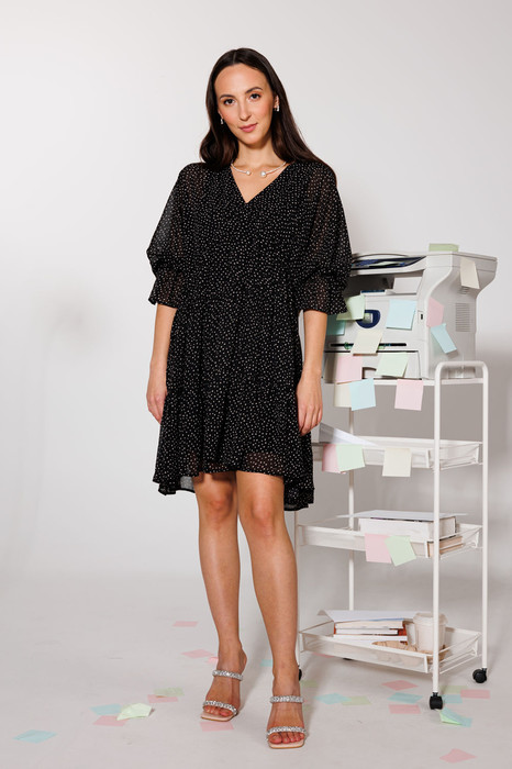 Принтованное платье свободного силуэта со сборками. Рукав на резинке для удобства при носке. Романтичное настроение и игривая походка - это то, что подарит вам это платье. Платье выполнено из шифона с дизайнерским принтом "горошек" в ретро тонах. На подкладке. Длина - 84 см.