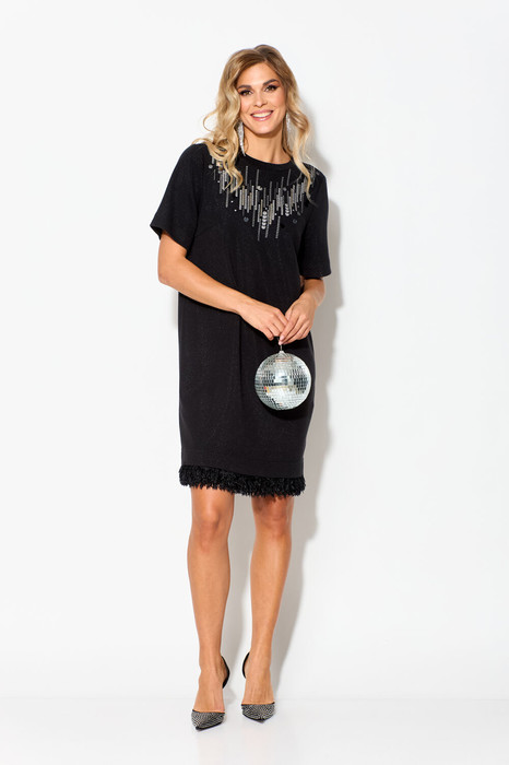 Платье женское, полуприлегающего силуэта, с втачными рукавами, длиной до коленей. Деталь переда  платья с нагрудными вытачками, вверху расположена аппликация-печать и прикреплены «пайетки с бусинами». Деталь спинки платья со средним швом, который заканчивается разрезом. Рукава втачные одношовные,  короткие. Вырез горловины платья округлой формы, с втачной бейкой. По низу платья съемный элемент из отделочной ткани, который застегивается на 15 петель и 15 пуговиц.