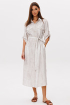Платье женское из вискозной ткани, полуприлегающего силуэта,прямое книзу, длиной до середины икр, в боковых швах обработаны разрезы, со съемным поясом из декоративной тесьмы. Деталь переда платья с нагрудными вытачками. Вырез горловины – «V-образной» формы. Платье: длинасередины спинки – 130см.