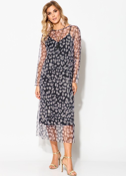 Комплект женский нарядный, состоящий из двух слоев платья. Верхнее платье свободного силуэта из сетки под фатин с принтом, со спущенной линией плеча, с втачными рукавами, длиной до середины икр, со съемным декоративным шнуром. Рукава втачные одношовные. Нижнее платье из атласной  ткани полуприлегающего силуэта, длиной ниже коленей, на бретелях. Деталь переда – с нагрудными вытачками.