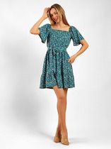 Платье молодежное из тканого полотна «штапель» с набивным рисунком, длиной до колена, свободного покроя, отрезное по линии талии, вытачками в области груди, с широкими рукавами на основе «реглан». Горловина прямоугольной формы – расширенная и углубленная. Рукава присборены по верхним срезам при помощи эластичной тесьмы в краевых швах. Верхние срезы спинки и полочек, образующие горловину, окантованы основным материалом. Юбка присборена по швам соединения с лифом с помощью эластичной тесьмы, понизу - оборка. Изделие комплектуется съемным поясом, завязывающимся на талии.
