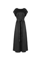 Платье женское без подкладки, полуприлегающего силуэта длиной выше колена. Вырез горловины круглый. По переду средний шов, талиевые вытачки и прорезные функциональные карманы с листочкой. Спинка со средним швом и талиевыми вытачками. Застежка на потайную тесьму-молнию в среднем шве спинки. Рукава длинные с  разрезом по низу переходящим в складку, который украшен красивыми  пуговицами с камнями.