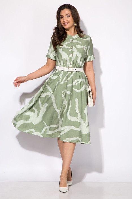 Летящее весенне-летнее платье с коротким рукавом, отрезное по талии. Пышная юбка полу солнце и создает по-девичьи трогательный и мечтательный образ. Застежка с обработанными планками на петли и пуговицы до линии талии.  На лифе расположен ассиметричный накладной карман. Вырез горловины округлый, на плоско лежащей стойке. Платье с карманами. По линии талии предусмотрена резинка для комфортного прилегания. В комплекте пояс из эко-кожи в тон изделия.