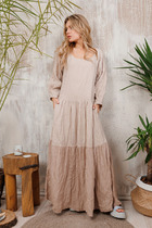 Платье с округлым вырезом горловины и отрезное по талии. Перед с декоративной пуговицей в верхней части, фигурным вырезом и со складками в нижней части. Спинка с потайной молнией в среднем шве и талиевыми вытачками. Рукава втачные, выполненные из ажурной сетки с серебристым напылением. Изделие со съёмным поясом по талии и карманами в боковых швах.