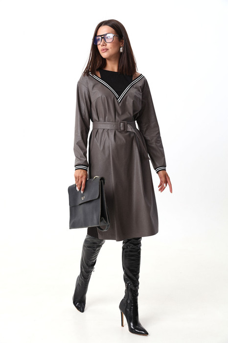 Платье свободного силуэта длины ниже колена с длинными втачными рукавами, выполнено из двух видов ткани. По переду платья имитация топа и открытыми плечами. Отделка горловины платья  и манжеты выполнены из довязов в контрастном цвете. Платье дополнено поясом. Рост фотомодели 175 см. Размер у фотомодели – 44.