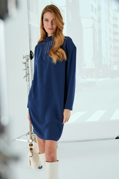 Платье выполнено из вискозной ткани. Платье прямого силуэта. Рукав длинный, линия плеча спущенная, воротник стойка. В среднем шве спинки расположена застежка на тесьму-молнию. По переду платья выполнена декоративная вышивка с сеткой. Платье имеет длину до линии колена.
