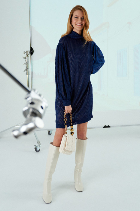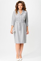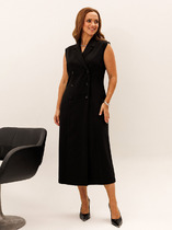 Платье силуэта «кокон». Имеет спущенную линию плеча, рукав длинный со сборкой по плечу и с манжетой по низу. В среднем шве спинки застежка на навесные петли-пуговицы. Воротник-стойка. Имеет второе платье-комбинацию на бретелях.