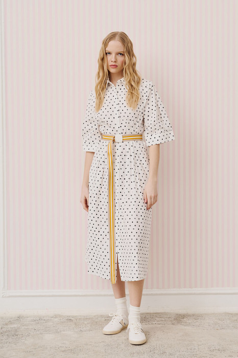 Платье полуприлегающего силуэта, выполнено из хлопковой ткани, дизайн горох. Рукав втачной, короткий, по низу рукава манжета с застежкой на петли и пуговицы. Воротник рубашечного кроя, застежка на петли и пуговицы, в боковых швах карманы. По переду и спинке в области талии складки, по спинке кокетка. К платью прилагается пояс.