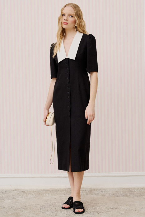 Платье прилегающего силуэта, выполнено изо льна. Рукав втачной, короткий, верхняя часть рукава собрана на сборку. По горловине отстегивающийся воротник, выполненный из отделочной хлопковой ткани, застёжка центральная на петли и пуговицы.  По переду и спинке для облегания талевые вытачки.