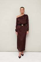 Шифоновое платье, которое идеально подойдёт для создания лёгкого многослойного образа. Платье состоит, из двух слоёв. Верхний слой выполнен из нежного шифона, нижний - это комбинация из трикотажной лёгкой подкладки. Платье свободного кроя «А»-силуэта с втачным длинным рукавом, по низу рукава притачная манжета на застёжку петли и пуговицы. По горловине стойка, по переду притачная планка, застёжка центральная на петли и пуговицы. К нижней части лифа платья ярусами нашиты воланы в сборку. В комплект входит кожаный ремень.