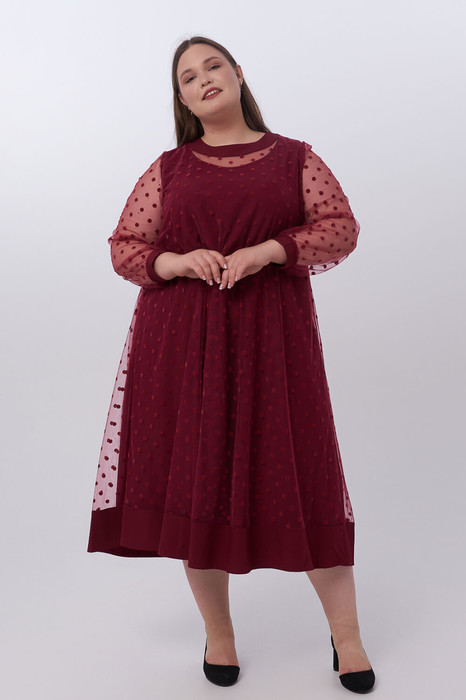 Оригинальное двойное платье А - образного силуэта. Верхний слой платья выполнен из мягкой сетки флок «горох». Круглый вырез горловины оформлен притачной обтачкой и дополнен по центру спинки застежкой на петлю и пуговицу. Рукава втачные длинные, по низу дополнены трикотажной манжетой. Широкая притачная вставка по низу и обтачка горловины в качестве отделки выполнены из ткани компаньона. Нижний слой платья выполнен из плательной ткани в тон верха. Горловина оформлена окантовкой. Слои скреплены между собой в области проймы. Модель прекрасно подойдет обладательницам любых форм и поможет создать интересный вечерний образ.