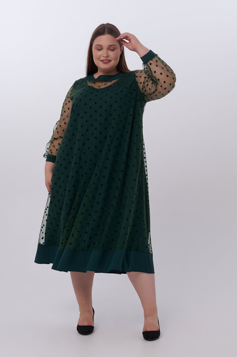 Оригинальное двойное платье А - образного силуэта. Верхний слой платья выполнен из мягкой сетки флок «горох». Круглый вырез горловины оформлен притачной обтачкой и дополнен по центру спинки застежкой на петлю и пуговицу. Рукава втачные длинные, по низу дополнены трикотажной манжетой. Широкая притачная вставка по низу и обтачка горловины в качестве отделки выполнены из ткани компаньона. Нижний слой платья выполнен из плательной ткани в тон верха. Горловина оформлена окантовкой. Слои скреплены между собой в области проймы. Модель прекрасно подойдет обладательницам любых форм и поможет создать интересный вечерний образ.