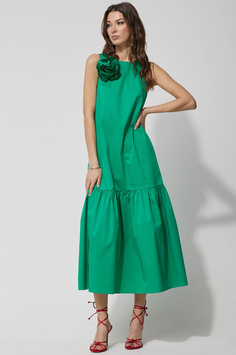 Платье А – силуэта из хлопковой ткани. Горловина округлая, по спинке застежка на молнию. По низу платья волан со сборкой от подреза. По переду нагрудные вытачки. В комплект сходит съемный декор.