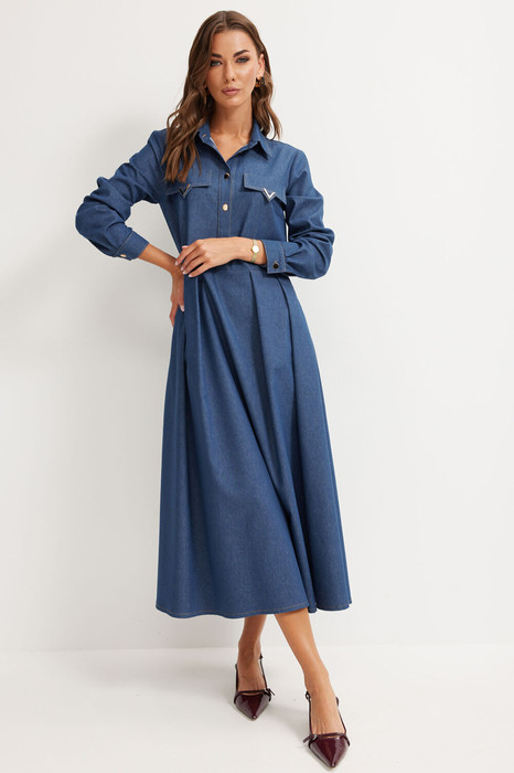 Платье прямого силуэта расширенное к низу из плательной ткани. Воротник рубашечного типа с застежкой по центру на петли и пуговицы. Платье отрезное по линии талии. От подреза на талии вниз заложены декоративные складки. В боковых швах карманы. По переду на лифе нагрудные вытачки и декоративные клапаны. В комплект входит пояс из основной ткани. Обращаем ваше внимание, что фурнитура может отличаться от фото.