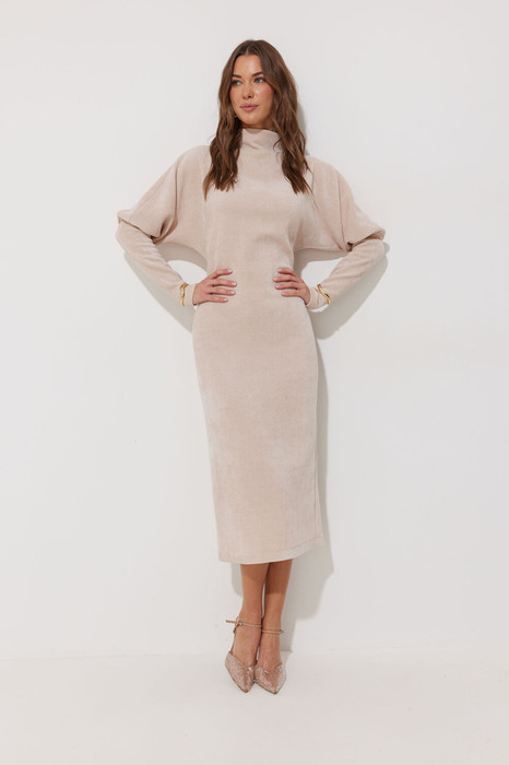 Платье полуприлегающего силуэта из трикотажного полотна. Горловина - цельнокроеная стойка. Рукав цельнокроеный, с подрезом выше уровня локтя и узкой длинной манжетой.