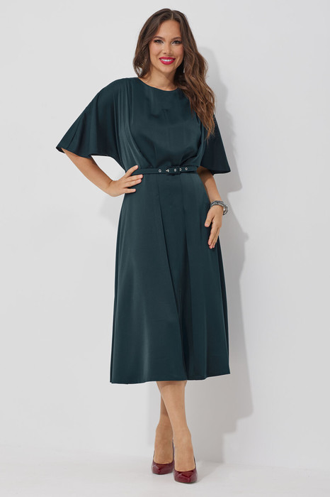 Элегантное платье А-образного силуэта. Выполнено из шелковистой ткани средней плотности с атласным блеском. Платье отрезное по талии. Верх платья свободный с цельнокроеным рукавом-крылышком. По плечам аккуратная драпировка. По спинке застежка на потайную молнию. Платье на подкладке.  Длина платья от плечевого шва 126см  Длина рукава 33см.
