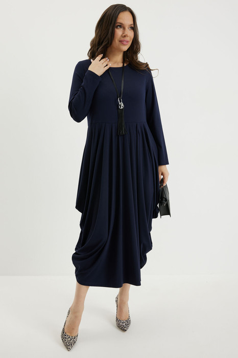Безумно стильное и элегантное платье в благородном синем оттенке. Верх платья базовый с втачным длинным рукавом и округлой горловиной. По талии платье притачное с чуть завышенной линией талии. Низ платья собран по талии в красивые складки, что создает необыкновенный струящийся объем, который укладывается в оригинальный силуэт. Платье выполнено из тонкого гладкого трикотажного полотна. Длина платья от плечевого шва 120см. Длина рукава 59см.