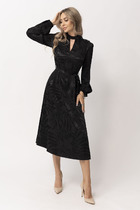 Платье отрезное по талии со складками по обе стороны от линии талии. Воротник-стойка. Кокетка по спинке, переходящая наперед. Из линии кокетки на линию плеча выходит складка.  Рукав втачной с декоративной складкой, доходящей до низа рукава с пуговицей по низу. Спинка со средним швом и шлицей. В комплекте пояс из основной ткани. Платье имеет карманы с отрезным бочком.
