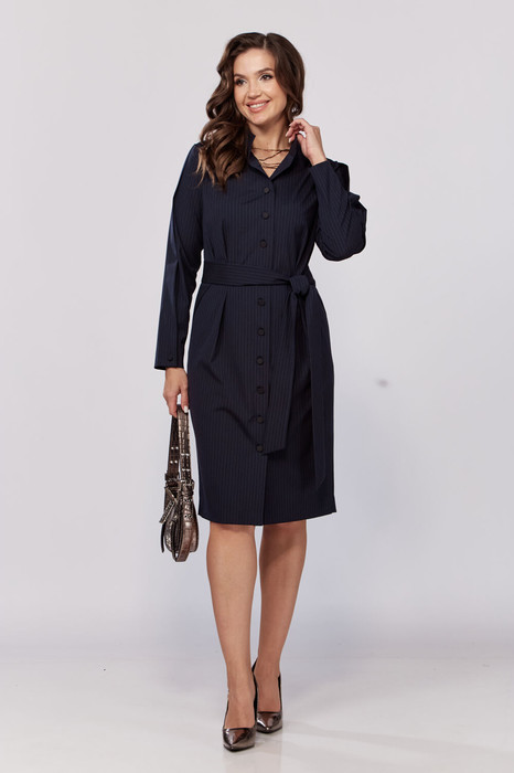 Платье отрезное по талии со складками по обе стороны от линии талии. Воротник-стойка. Кокетка по спинке, переходящая наперед. Из линии кокетки на линию плеча выходит складка. Рукав втачной с декоративной складкой, доходящей до низа рукава с пуговицей по низу. Спинка со средним швом и шлицей. В комплекте пояс из основной ткани. Платье имеет карманы с отрезным бочком и застежку на пуговицы