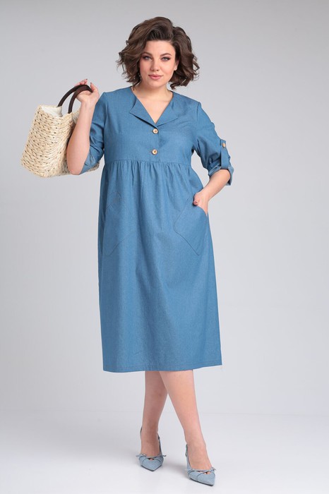 Повседневное женское платье из хлопковой джинсовой ткани средней плотности. Платье свободного кроя, с центральной застежкой на петли-пуговцы и раскладными лацканами. Лиф и спинка отрезные. Рукав втачной 3/4, фиксируется на пату, застегивающуюся на пуговицу. Нижняя часть платья с небольшой сборкой, по переду юбки два накладных функциональных кармана. Платье – универсально, в нем можно выглядеть очаровательно и романтично на прогулке, практично и деловито в офисе. Натуральный состав, классическая длина и силуэт — сделают это изделие любимым в наступающем сезоне. Платье прекрасно сочетается с разной по стилю обувью. Длина по спинке 117 (+-1) см, длина рукава 48 (+-1) см. Изделие подойдёт на рост 170 см.