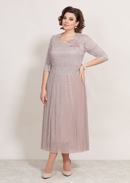 Нарядное, отрезное по линии талии платье с отлетным кружевным лифом (имитация комплекта, лиф платья соединен с юбкой атласной подкладкой) и юбкой из легкой гофрированной ткани с люрексом, расширяющейся к низу  (все ткани тянутся).  Втачной короткий рукав выполнен, как и лиф платья,  из кружева с напылением. Юбка платья с рельефами. Потайная застежка-молния  в боковом шве платья.  Лиф платья украшает брошь ручной работы. Великолепное  платье, в котором  Вы будете блистать на любом торжественном мероприятии!