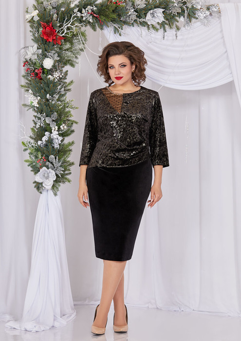 Нарядное женское платье, полу-прилегающего силуэта, выполнено из эффектного, принтованного велюра с блеском и однотонного велюра. Лиф платья выполнен из принтованного велюра с блеском, отрезной ниже линии талии. Горловина округлой формы, на обтачке, декорирована вставкой из сетки в горох с подложкой телесного цвета, что имитирует прозрачность и эффектной цепочкой. Также по линии талии лиф присборен в складки, что прекрасно маскирует некоторые нюансы фигуры. Юбка платья выполнена из однотонного велюра, слегка заужена к низу. Спинка выполнена из однотонного велюра, со средним швом и вытачками. Рукав втачной, оптимальной длины, выполнен из принтованного велюра с блеском. Роскошное платье для обладательниц роскошных форм!