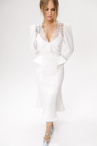 Нарядное женское платье, полу-прилегающего силуэта, выполнено из плиссированной ткани с пайетками. Лиф платья с V-образной горловиной, по линии талии отрезной, на резинке. Лиф платья двойной, нижняя часть из атласа, верхняя часть свободного покроя из плиссированной ткани, со спущенным рукавом, по линии талии декор в виде аппликации из кружева. Юбка расклешенного силуэта, присборена по линии талии, на подкладке. Спинка идентична полочке, отрезная по линии талии, с резинкой. Эффектное платье из яркой ткани отличный выбор для любого мероприятия!
