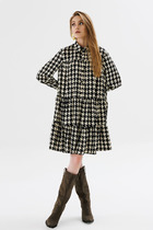 Платье на подкладке свободного силуэта с V-образным вырезом горловины. По переду мягкая складка декорированная металлическим пришивным элементом. Рукав втачной одношовный с резинкой по низу. Изделие дополнено съемным ремнем. Длина платья по спинке-108 см. Длина рукава 48 см.