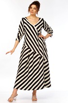 Платье А- образного силуэта на подкладке. По переду V-образный вырез горловины и декоративные подрезы. Ткань тянется, что обеспечивает хорошую посадку на любую фигуру.  Спинка с талевыми вытачками и средним швом. В среднем шве застежка потайная молния. Рукав втачной двушовный длиной 3/4. Длина платья 110 см, длина рукава 48 см.