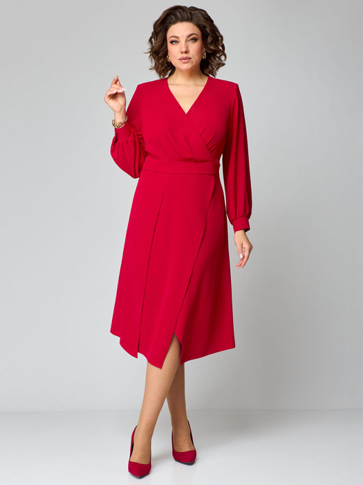 Элегантное женское платье прямого силуэта из легкой струящейся ткани. Перед отрезной по линии талии. Лиф  на запах с мягкими складками. Юбка на запах с отлетной деталью. Спинка со средним швом и талиевыми вытачками,  застежкой на потайную тесьму-молнию. V-образный вырез горловины. Рукав втачной одношовный присборен по низу на притачной манжете, застегивается на 1пуговицу и петлю. Платье с плечевыми накладками. Платье без подкладки.