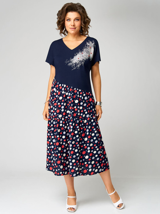Платье,   в котором комфортно - платье А- силуэта с ассиметричным подрезом лиф выполнен из трикотажного полотна, юбка из штапеля принт в «горохи». Горловина с V-образным вырезом. По переду с правой авторская печать и расшитыми бусинами. По юбке волан с легкой сборкой. Платье без подкладки.