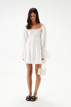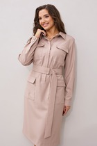 Платье полуприлегающего силуэта с V-образным вырезом. Перед и спинка со средним швом. В среднем шве спинки шлица. Карманы в боковых швах. Рукав «летучая мышь». Дополнением служит пояс-ремень