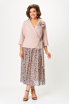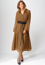 Платье полуприлегающего силуэта. Перед с нагрудными вытачками. Спинка со средним швом, заканчивающимся шлицей. Рукава втачные одношовные. Горловина обработана бейкой из основной ткани. Дополняет модель пояс.
