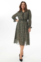 Платье полуприлегающего силуэта на подкладке, перед на запах со сборкой, спинка со среденим швом и талиевыми вытачками. Рукав втачной, одношовный.