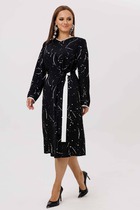 Платье свободного силуэта, перед с нагрудными вытачками. Рукава втачные, одношовные. Спинка со средним швом, с застежкой на тесьму-молнию. Горловина и низ рукава обработаны отделочной тканью. Изделие завязывается за счет контрастного полупояса.