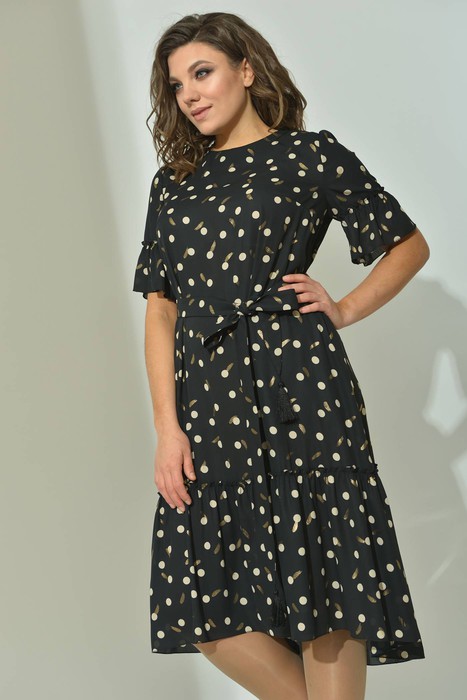 Платье женское свободного силуэта выполнено из тонкой плательной ткани. Перёд с нагрудными вытачками. По спинке центральный шов и V- образная горловина на завязке. Рукава одно шовные втачные короткие. Горловина круглая. По низу платья и рукава притачной волан. Дополнением изделия служит пояс.