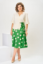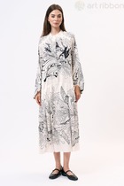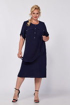 Женское платье – рубашка свободного силуэта выполнено из хлопко содержащей ткани. По переду нагрудные вытачки, потайная застёжка на прорезные петли и пуговицы, декоративная печать. По спинке кокетка и две небольшие складки. Воротник отложной на стойке. Рукава одношовные втачные на манжете. Горизонтальный подрез по низу платья и низ платья обработан контрастным кантом. В боковых швах функциональные карманы. Платье без подкладки. Дополнением служит пояс.
