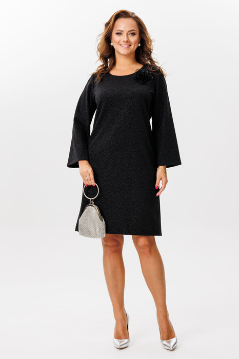 Нарядное платье, выполненное из крепа на трикотажной основе с тоненькой нитью люреска (тянется). Платье А-силуэта. Спинка со средним швом. Горловина округлой формы, обработана окантовкой. Рукава втачные, одношовные, расширенные к низу. Платье декорировано съемным цветком на булавке (цветок может отличаться от фото). Платье без подкладки.