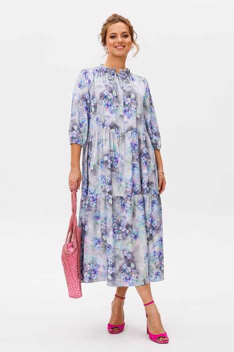 Платье отрезное чуть выше линии талии. Верхняя часть переда с V-образным вырезом и цельнокроенными планками. Горловина оформлена рюшей, присборенной резинкой с завязками. По нижней части платья два ряда присборенных воланов. Рукава втачные одношовные, по низу собраны на резинку. Платье без подкладки.