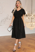 Нарядное женское платье прямого силуэта, выполненное из плательной шифоновой ткани (не тянется), на трикотажной подкладке (тянется). Платье отрезное по линии талии. По лифу переда центральная застежка на петли-пуговицы. Горловина округлой формы, обработана окантовкой, переходящей в завязки. В горизонтальный подрез по переду вставлен волан. Нижняя часть платья присборена по линии подреза. По низу платья – настрочной широкий волан. Рукава втачные, одношовные. Низ рукава собран резинкой, по центру рукава декоративная завязка-бантик.
