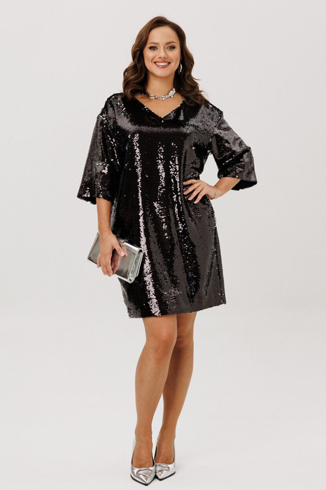 Нарядное женское платье свободного силуэта со спущенной линией плеча, выполнено из плательной ткани с пайетками (не тянется). Перед и спинка – цельные. Горловина по переду V-образной формы, по спинке – округлой формы, в вырез которой вставлен декоративный бант из шифона. Рукава втачные, одношовные. Платье на подкладке.